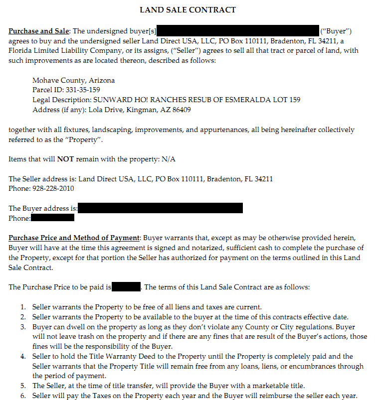 This packet will include your Land Contract, Promissory Note, and Purchase Sale Agreement.
